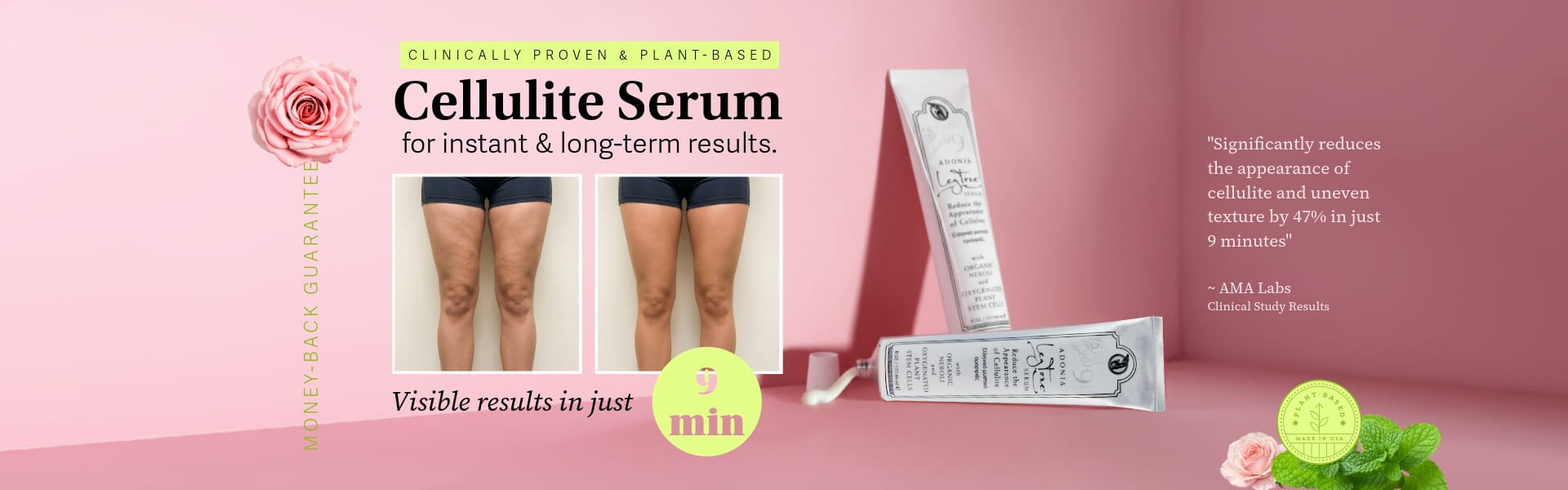 According to a clinical study done by AMA Labs, Adonia LegTone Serum demonstrated a 47% decrease in the appearance of cellulite within 9 minutes! Within 6 weeks, an average of 72% decrease in the appearance of cellulite was reported by study participants.